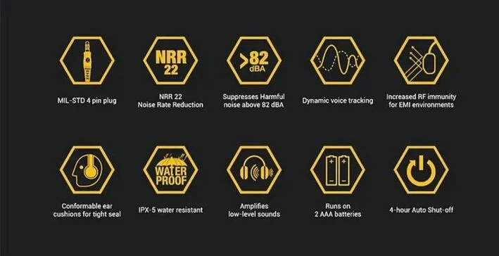 Навушники придушують небезпечні шуми понад 82 дБ, підсилюють звуки навколишнього середовища та створюють 360° ситуаційну обізнаність завдяки вбудованим стереомікрофонам. Це дозволяє точно визначати напрямок звуку: голос, кроки, постріли чи рух техніки.