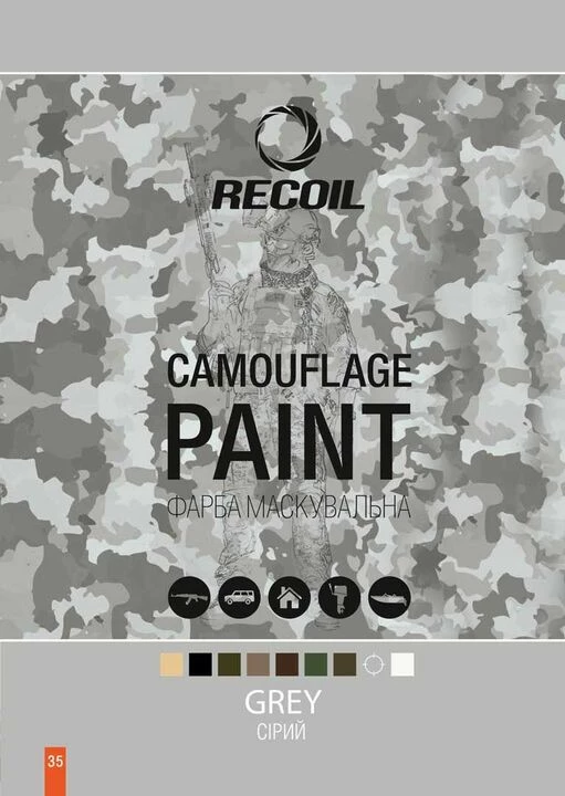 Аерозольна фарба Recoil підходить для будь-яких поверхонь. Швидко висихає. Не вблискує на сонці
